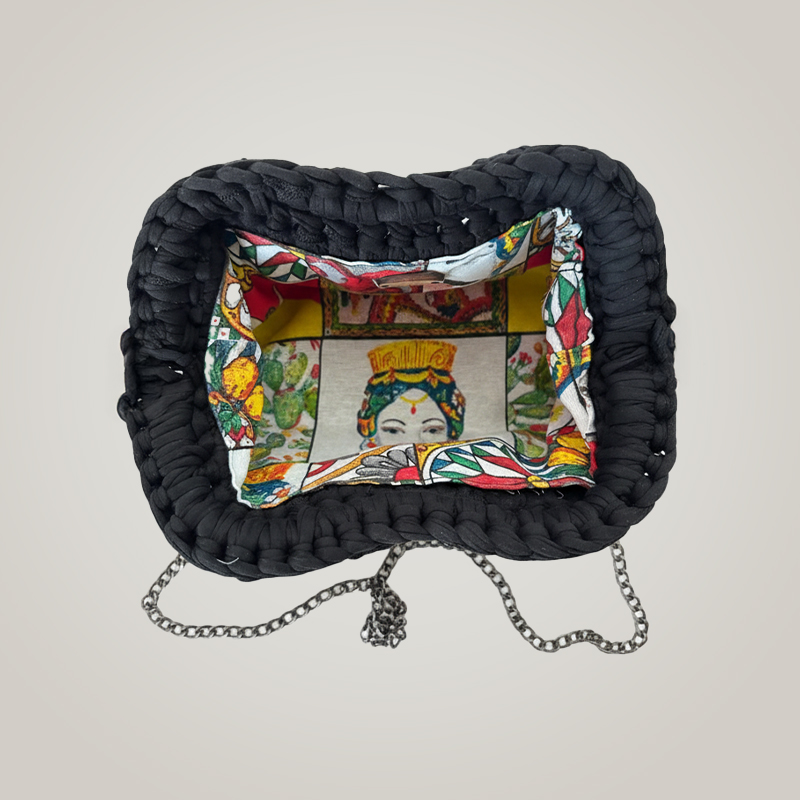 Clutch in crochet nero con paillettes, fodera a stampa siciliana e tracolla rimovibile.
