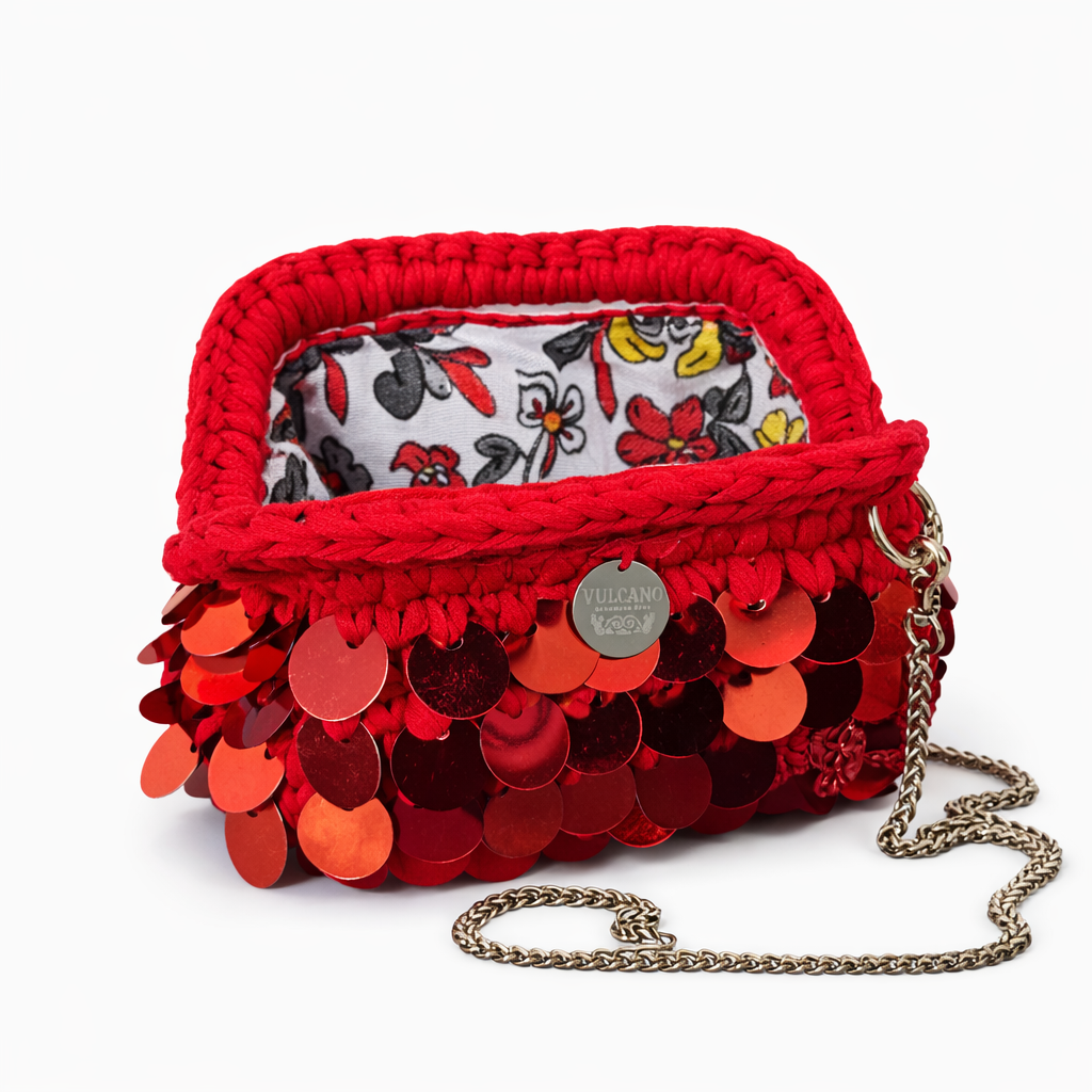 Questa splendida pochette rossa all’uncinetto, realizzata a mano, è pensata per non passare inosservata, grazie alle vivaci paillettes rosse che brillano ad ogni movimento e catturano la luce in modo meraviglioso.