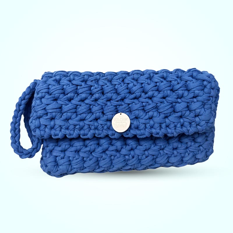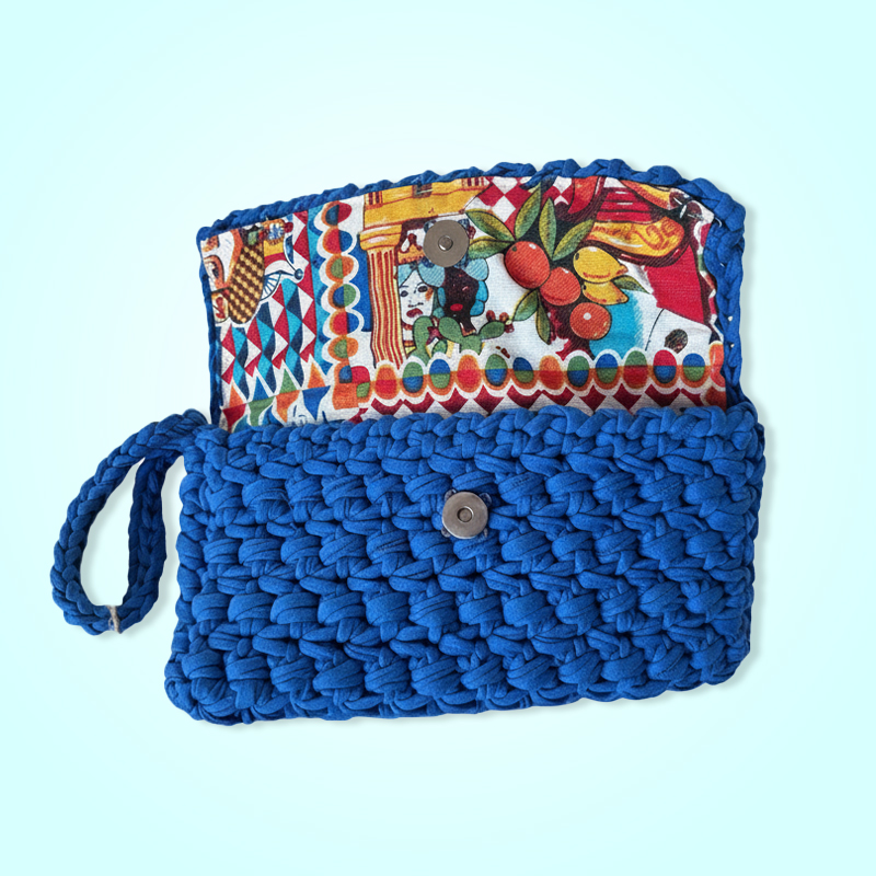 NAXOS is a light blue wristlet adorned with Sicilian prints — compact, vibrant, and perfect for seaside strolls.