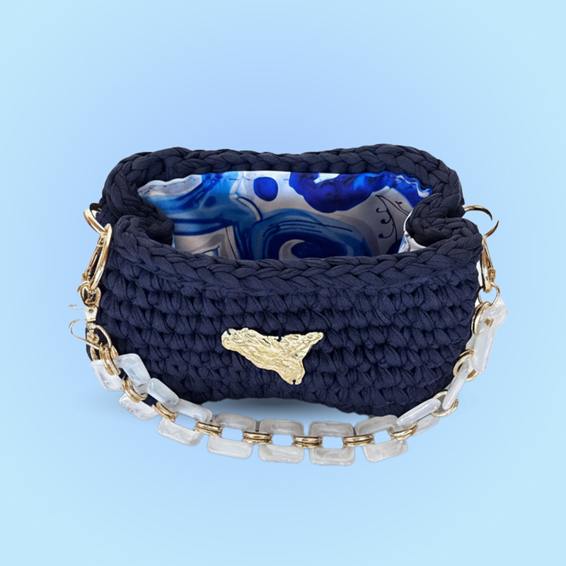 Elegante borsa blu con effetto madreperla, ispirata alla bellezza senza tempo delle ceramiche di Caltagirone.