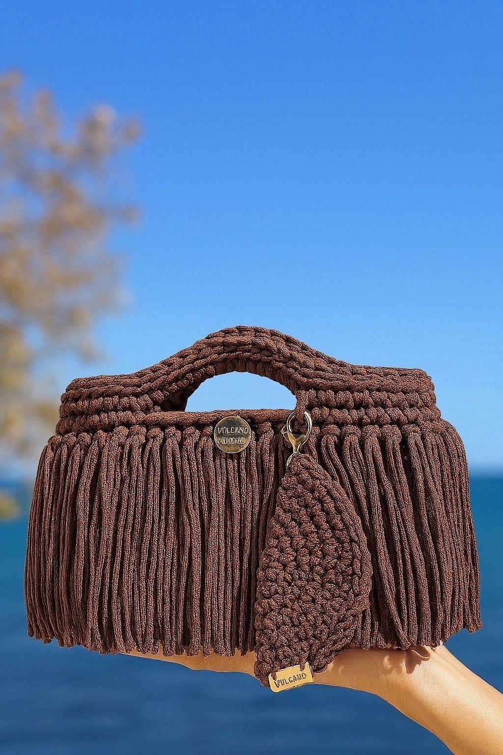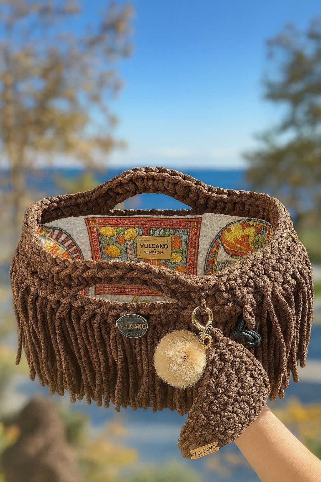 Handheld bag with a solid leather base, Sicilian fabric lining, and a remevable glasses holder. A handcrafted accessory combining structure and functional elegance.