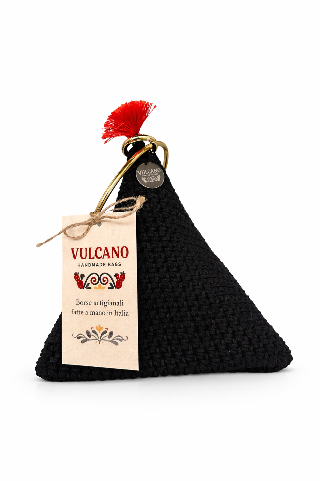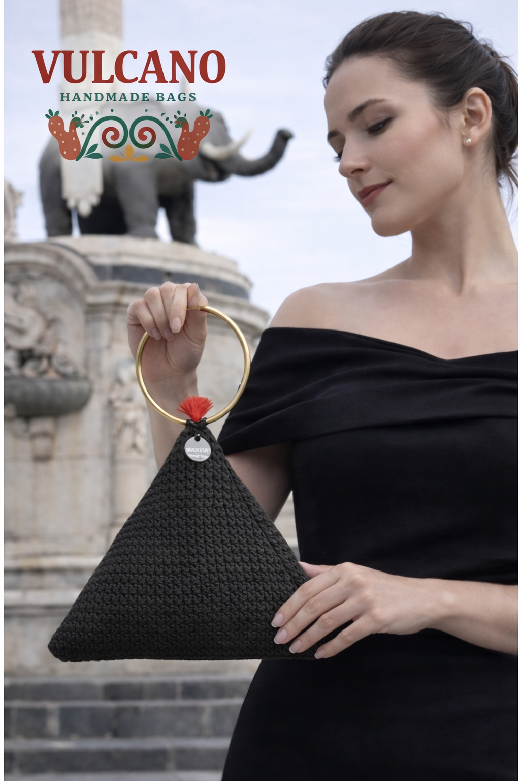 Un’iconica borsa realizzata a mano con un design intrecciato e un interno rosso vulcano. Elegante, distintivo, unico.